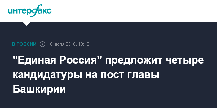 Москва. 16 июля. INTERFAX.RU - "Единая Россия" предложит президенту РФ четыре кандидатуры на пост президента Башкирии, сообщил председатель Высшего совета партии Борис Грызлов.