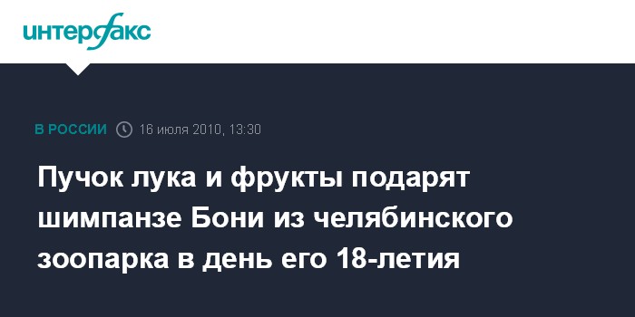 Москва. 16 июля. INTERFAX.RU - В зоопарке Челябинска 18 июля отметят день рождения шимпанзе Бони.