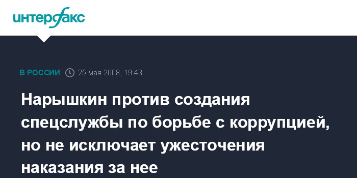 Москва. 25 мая. ИНТЕРФАКС - Глава администрации президента Сергей Нарышкин заявил, что не видит необходимости в создании специальной службы по борьбе с коррупцией в России, но не исключил возможности внесения в законодательство поправок, ужесточающих ответственность за коррупционные деяния.