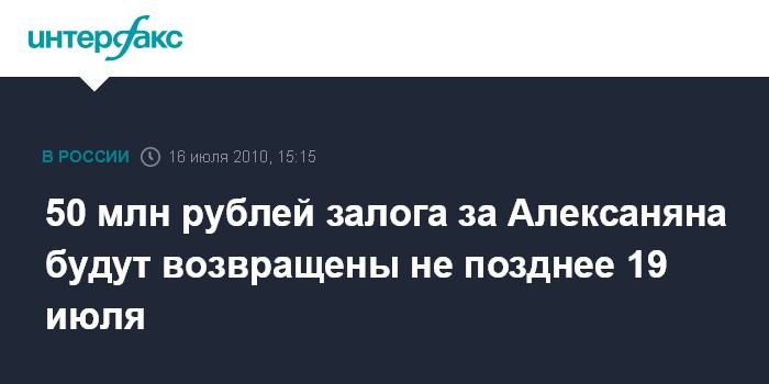 50 млн рублей залога за Алексаняна будут возвращены не позднее 19 июля