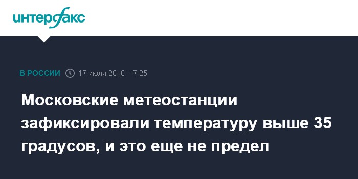 В Гидрометеобюро Москвы и Московской области сообщили "Интерфаксу", что в 16:00 базовая метеостанция города на ВВЦ зафиксировала температуру в районе плюс 35 градусов. "Это почти на 1,5 градуса превышает температурный рекорд 1951 года, когда воздух в столице прогрелся до 33,7 градуса", - сказал собеседник агентства.