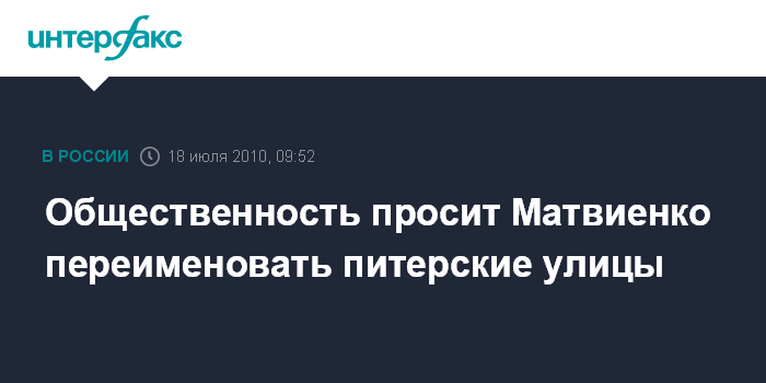 Москва. 18 июля. ИНТЕРФАКС - Участники проекта "Возвращение" обратились к мэру Петербурга Валентине Матвиенко с просьбой содействовать переименованию нескольких десятков улиц северной столицы.