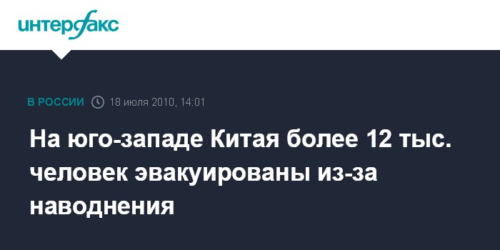 Пекин. 18 июля. INTERFAX.RU - В результате наводнения в районе города центрального подчинения Чунцин на юго-западе КНР в воскресенье были эвакуированы 12,3 тыс. человек, сообщают в воскресенье китайские СМИ. В результате проливных дождей вода затопила несколько районов уезда Туннань, находящегося в юрисдикции муниципалитета Чунцин.