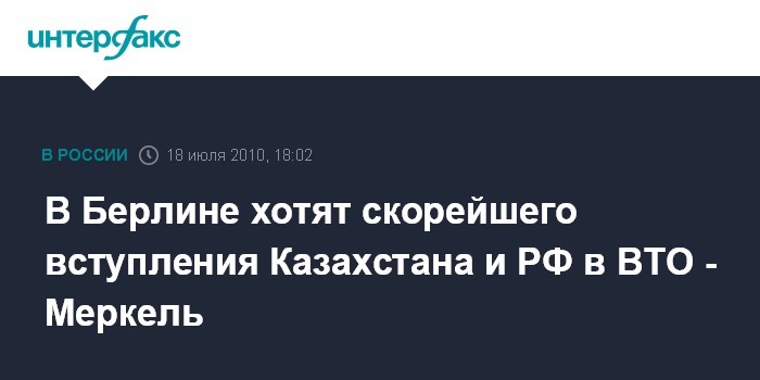 Астана. 18 июля. INTERFAX.RU - Германия рассчитывает на скорейшее вступление Казахстана и России во Всемирную торговую организацию, заявляет канцлер ФРГ Ангела Меркель.