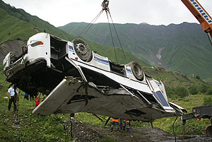 На югоосетинском участке Транскама в пропасть упал рейсовый автобус, следовавший из Владикавказа в Цхинвали, погибли 11 человек, их личности опознаны