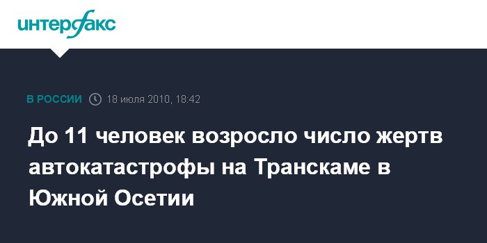 Цхинвали. 18 июля. INTERFAX.RU - По последним данным МЧС Южной Осетии, в результате аварии на Транскаме погибли 11 пассажиров автобуса, среди них - два ребенка. "В больницу Цхинвали доставлено 10 человек, одна девушка от полученных ранений скончалась по дороге", - сообщил собеседник агентства в МЧС республики.