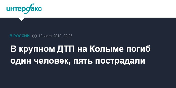Магадан. 19 июля. ИНТЕРФАКС-ДАЛЬНИЙ ВОСТОК - Один человек погиб, еще пятеро пострадали, в том числе два ребенка, в крупном дорожно-транспортном происшествии в Магаданской области.