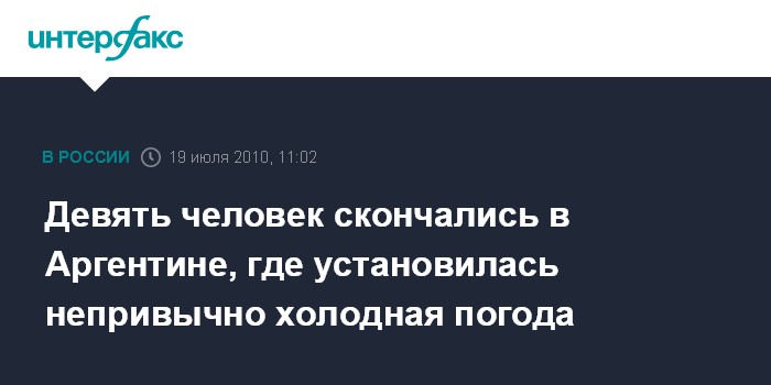Москва. 19 июля. INTERFAX.RU – Непривычно холодная погода в Аргентине привела к гибели девяти человек, сообщает в понедельник британская телерадиокорпорация Би-би-си.