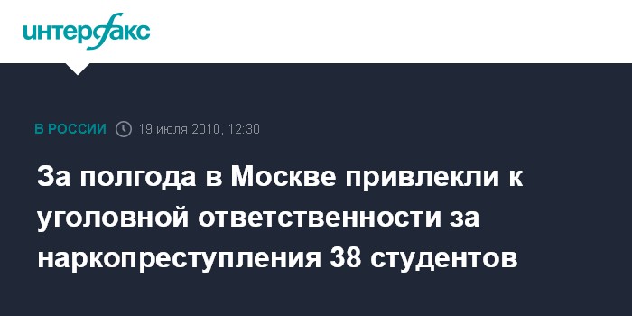 Москва. 19 июля. INTERFAX.RU – В первом полугодии текущего года в Москве к уголовной ответственности за наркопреступления привлечены 38 студентов, сообщил начальник столичного УФСКН Вячеслав Давыдов на пресс-конференции в центральном офисе "Интерфакса" в понедельник.
