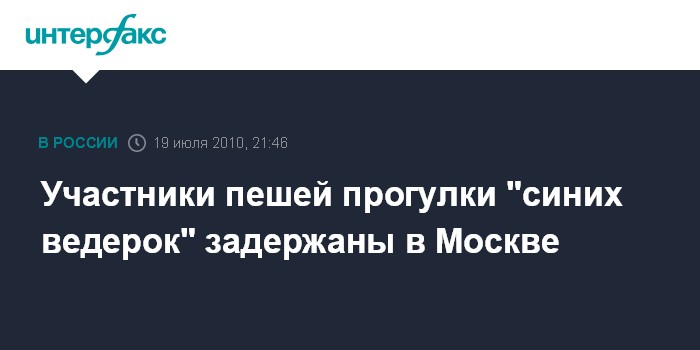Москва. 19 июля. INTERFAX.RU - 10 участников пешей прогулки, организованной обществом "Синие ведерки", были задержаны в центре Москвы в понедельник вечером, сообщили interfax.ru координаторы движения. Пешая прогула "ведерок" была анонсирована заранее на сайте движения и должна была пройти по маршруту от Манежной площади до ОВД "Китай-Город".