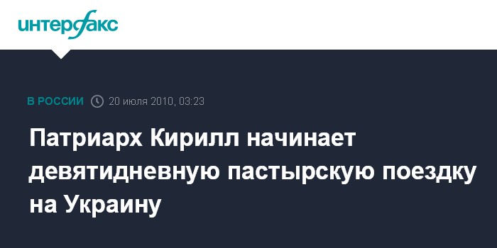 Москва. 20 июля. ИНТЕРФАКС - Патриарх Московский и всея Руси Кирилл с 20 по 28 июля совершит пастырскую поездку по Украине в продолжение начатой в 2009 году традиции ежегодных длительных посещений этой страны.