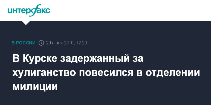 Ранее судимый и неоднократно привлекающийся к административной ответственности мужчина 17 июля был доставлен в милицию за мелкое хулиганство и помещен в КПЗ. Ожидая рассмотрения дела в мировом суде, задержанный повесился на кране с помощью куска ткани, оторванного от рубашки, говорится в сообщении.