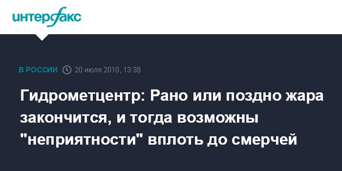 "Потенциальная угроза наступления природных катаклизмов после того, как сильную жару сменит похолодание, существует, однако каких-то конкретных прогнозов на этот счет нет", - сообщил "Интерфаксу" во вторник замдиректора Гидрометцентра РФ Геннадий Елисеев.