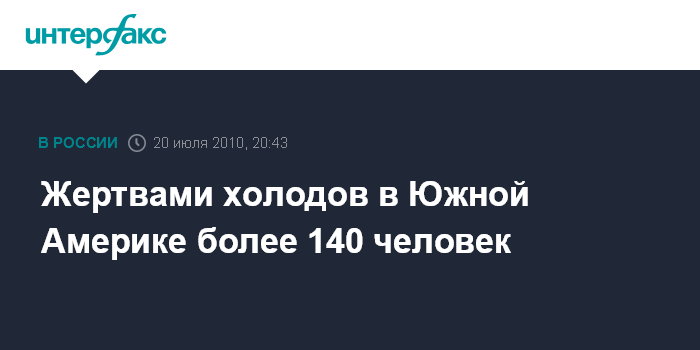 Каракас. 20 июля. INTERFAX.RU - Не менее 140 человек стали жертвами холодов в странах Южной Америки, передает во вторник венесуэльский телеканал "Телесур".