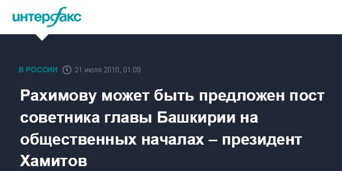 Уфа. 21 июля. ИНТЕРФАКС-ПОВОЛЖЬЕ - Новый президент Башкирии Рустэм Хамитов заявил, что намерен в качестве возможного варианта предложить своему предшественнику на этом посту Муртазе Рахимову стать советником главы республики на общественных началах.