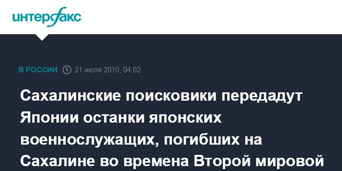 Южно-Сахалинск. 21 июля. ИНТЕРФАКС-ДАЛЬНИЙ ВОСТОК - Останки четырех японских военнослужащих, найденные сахалинскими поисковиками, будут переданы японской стороне в понедельник.