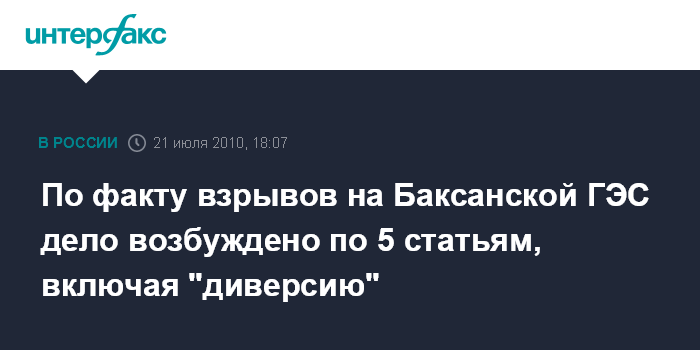 Москва. 21 июля. INTERFAX.RU - Главное следственное управление СКП РФ по Северо-Кавказскому и Южному федеральным округам возбудило уголовное дело по факту взрывов на Баксанской ГЭС по пяти статьям Уголовного кодекса РФ, в том числе по статье "Диверсия", сообщил "Интерфаксу" официальный представитель СКП РФ Владимир Маркин.