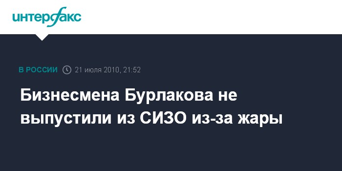 Москва. 21 июля. ИНТЕРФАКС - Аномальная жара помешала выйти из СИЗО бывшему вице-президенту "Финансовой лизинговой компании" Андрею Бурлакову, 50 млн руб. залога за освобождение которого семья внесла накануне, сказал адвокат Бурлакова Александр Забейда "Интерфаксу" в среду.
