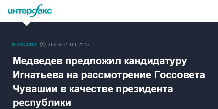Москва. 21 июля. ИНТЕРФАКС - Президент России Дмитрий Медведев внес на рассмотрение Госсовета Чувашии кандидатуру Михаила Игнатьева для наделения его полномочиями президента республики, сообщает пресс-служба главы государства.