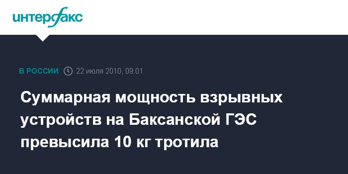Москва. 22 июля. INTERFAX.RU – Мощность взрывов на Баксанской ГЭС в Кабардино-Балкарии составила более 10 кг ТНТ, сообщил "Интерфаксу" в четверг источник в правоохранительных органах.