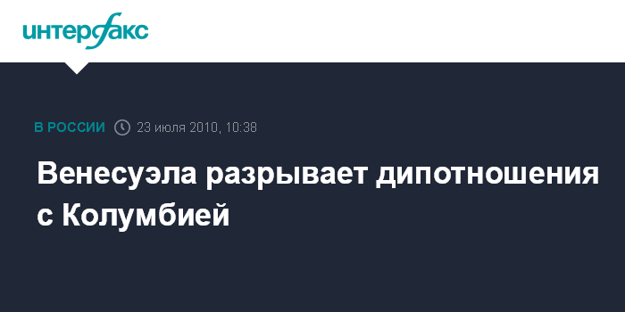 Москва. 23 июля. INTERFAX.RU – Президент Венесуэлы Уго Чавес заявил о разрыве дипломатических отношений с Колумбией после заявления представителя Колумбии Луиса Альфонсо Ойоса на экстренном заседании Организации американских государств (ОАГ) в Вашингтоне о том, что на территории Венесуэлы находятся около 1,5 тыс. боевиков Революционных вооруженных сил Колумбии (РВСК), сообщило в четверг агентство ЭФЭ.