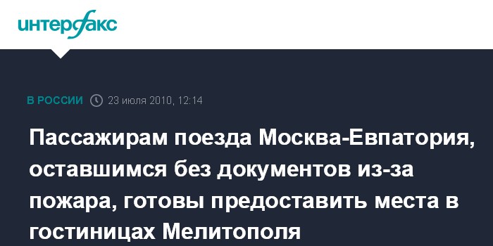Москва. 23 июля. INTERFAX.RU – Пассажирам поезда № 201 Москва-Евпатория, которые остались без документов вследствие пожара в вагоне, по их желанию готовы предоставить места в гостиницах Мелитополя, сообщили агентству "Интерфакс-Украина" в пресс-службе ГУ МинЧС Украины в Запорожской области.
