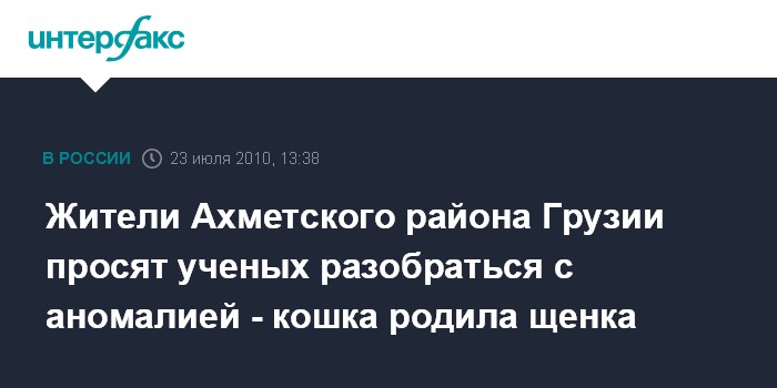 Москва. 23 июля. INTERFAX.RU - В Ахметском районе Грузии, как сообщают в пятницу грузинские СМИ, произошел аномальный случай - кошка родила щенка.