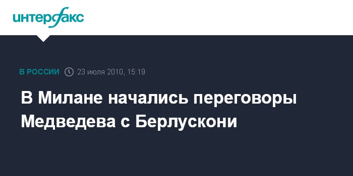 Милан. 23 июля. INTERFAX.RU - Президент РФ Дмитрий Медведев, прибывший в пятницу с рабочим визитом в Милан, начал переговоры с председателем совета министров Италии Сильвио Берлускони. Разговор двух лидеров проходит в префектуре Милана, которая расположена во дворце Диотти в здании, построенном в начале 16 века.