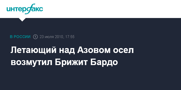Москва. 23 июля. INTERFAX.RU - Известная французская актриса и защитница животных Брижит Бардо обратилась к генпрокурору России Юрию Чайке с просьбой наказать предпринимателей из Краснодарского края, поднявших в воздух над морем осла на парашюте.