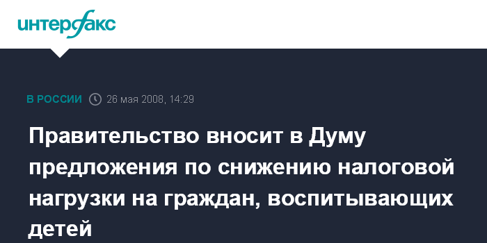 Москва. 26 мая. INTERFAX.RU - Премьер-министр РФ Владимир Путин сообщил, что правительство уже на этой неделе внесет в Госдуму изменения в налоговые законы, в соответствии с которыми будет, в частности, снижена налоговая нагрузка на граждан, воспитывающих детей.