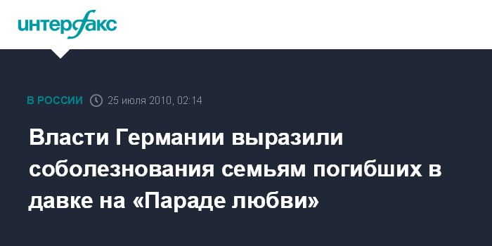 Москва. 25 июля. ИНТЕРФАКС - Канцлер и президент Германии, премьер-министр Северного Рейна-Вестфалии, а также обер-бургомистр Дуйсбурга выразили свои соболезнования семьям погибших в субботней давке в немецком городе Дуйсбург во время музыкального фестиваля "Парад любви", сообщает российский телеканал "Россия-24".