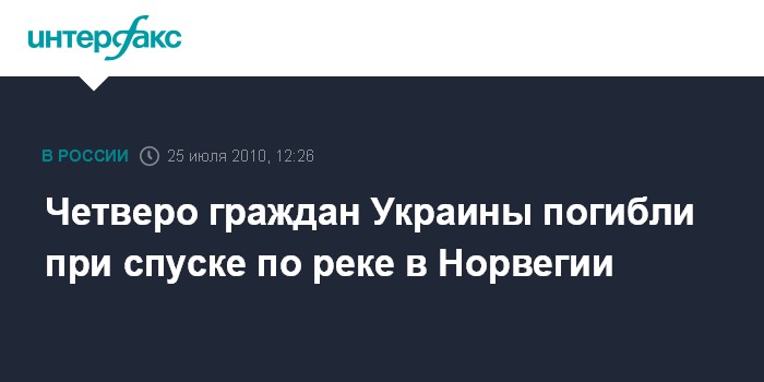 Киев. 25 июля. INTERFAX.RU - Четверо украинцев погибли во время спуска по реке Шоа (Sjoa) в окрестностях норвежского города Лиллехаммер, сообщает "5 канал" украинского телевидения со ссылкой на местный телеканал NRK. По предварительным данным, перевернулись три из шести двухместных лодок. Группа из Украины состояла из 13 человек. Тела погибших на вертолете вывезли с места трагедии. С раненными работают медики.