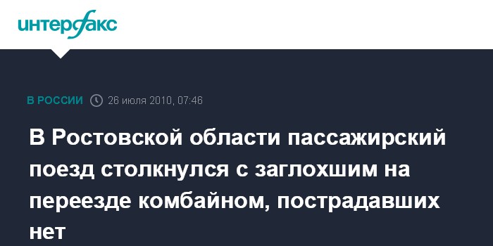Ростов-на-Дону. 26 июля. ИНТЕРФАКС-ЮГ - Происшествие с участием пассажирского поезда Орск-Адлер и комбайна произошло в Ростовской области, сообщили агентству "Интерфакс-Юг" в экстренных службах региона в понедельник.