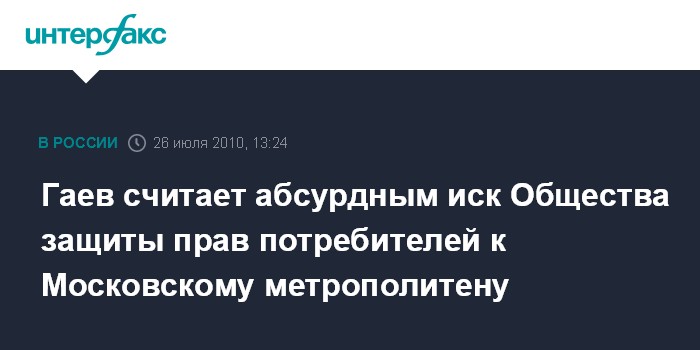 Москва. 26 июля. INTERFAX.RU - Начальник московского метро Дмитрий Гаев назвал "абсолютно абсурдным" иск к ГУП "Московский метрополитен", поданный Обществом защиты прав потребителей (ОЗПП). "Давайте еще на солнце подадим в суд за то, что так жарко. Этот иск - это все равно что подавать в суд по факту пожаров на подмосковных торфяниках", - заявил Д.Гаев на пресс-конференции в понедельник.