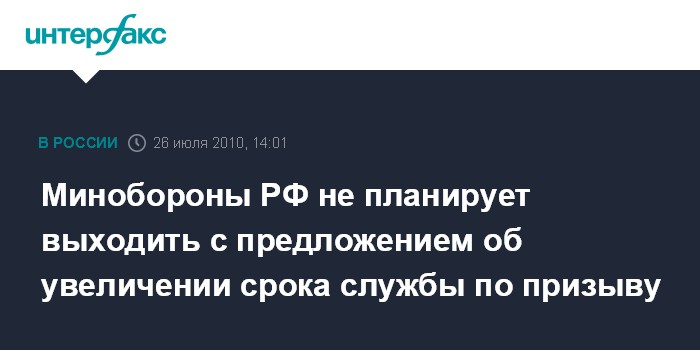 Москва. 26 июля. INTERFAX.RU – Российское военное руководство не рассматривает вопроса об увеличении срока срочной военной службы, которая сегодня составляет 12 месяцев, заявил в понедельник журналистам в Москве замначальника генштаба Василий Смирнов.