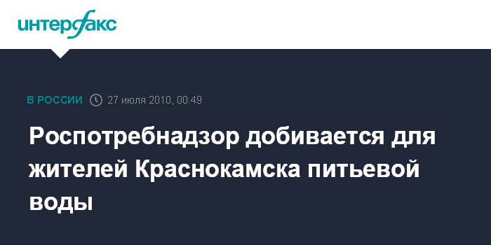 Москва. 27 июля. ИНТЕРФАКС - Роспотребнадзор намерен добиться строительства водопровода с питьевой водой в городе Краснокамск (Пермский край), жители которого получают техническую воду, которая вредна для здоровья.