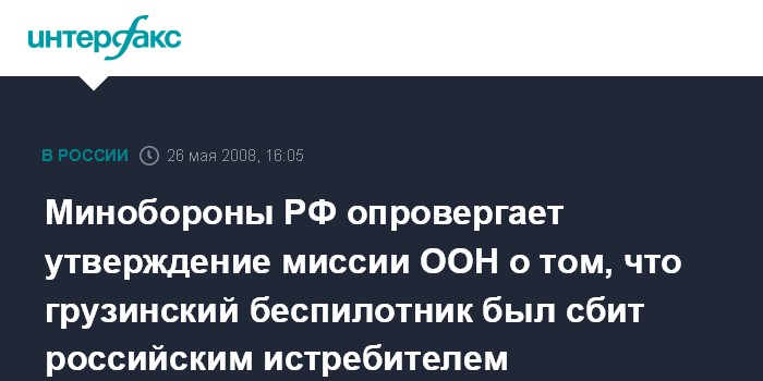 Москва. 26 мая. INTERFAX.RU - Минобороны РФ опровергло утверждение представителей миссии ООН в зоне грузино-абхазского конфликта о том, что грузинский разведывательный беспилотный летательный аппарат (БПЛА) 20 апреля был сбит российским истребителем.