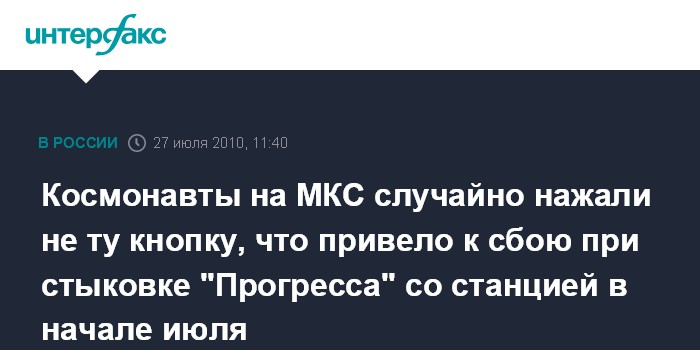 Москва. 27 июля. INTERFAX.RU – Сбой при стыковке с Международной космической станцией (МКС) грузового корабля "Прогресс М-06М" 2 июля произошел из-за зашумленности канала связи и случайного нажатия космонавтами одной из кнопок на панели управления, сообщил журналистам во вторник руководитель полета российского сегмента МКС Владимир Соловьев.