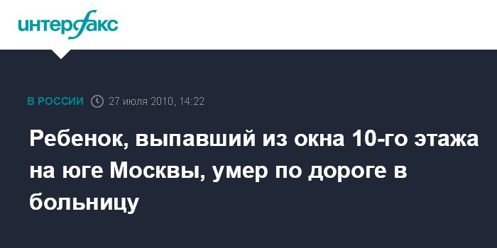 Москва. 27 июля. INTERFAX.RU - Четырехлетняя девочка, по неосторожности выпавшая во вторник из окна 10-этажа дома на юге Москвы, скончалась по дороге в больницу, сообщил "Интерфаксу" источник в правоохранительных органах. "Девочка умерла в результате сочетанной травмы", - сказал источник. Он добавил, что мать погибшей допрашивают об обстоятельствах случившегося в отделе внутренних дел.