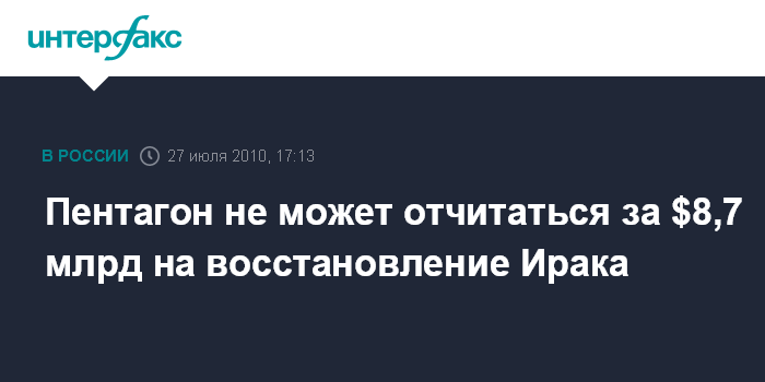 Лондон. 27 июля. INTERFAX.RU - Федеральные наблюдатели обвинили руководство вооруженных сил США в невозможности отчитаться за миллиарды долларов, направленные на восстановление Ирака, сообщает во вторник британская телерадиокорпорация BBC. По словам главного инспектора по вопросам реконструкции Ирака, министерство обороны США не может дать отчет по 96% данных средств, что составляет $ 8,7 миллиарда.