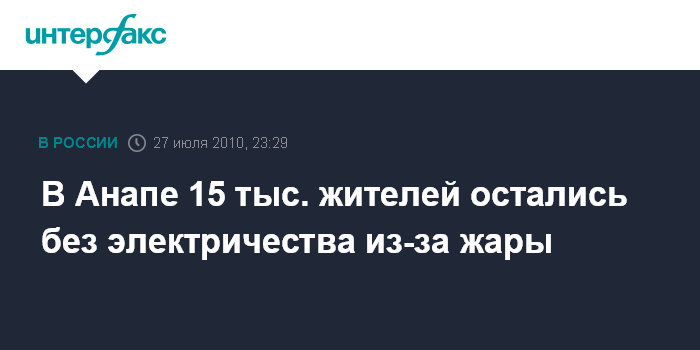 Краснодар. 27 июля. ИНТЕРФАКС-ЮГ - В Анапе (Краснодарский край) из-за внепланового ограничения подачи электроэнергии без света остались 15 тыс. жителей, сообщили агентству "Интерфакс-Юг" в коммунальных службах города во вторник.