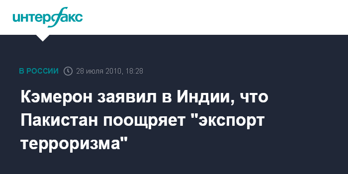"Мы не можем допустить ни в каком виде идею того, что Пакистану позволено занимать двойственную и этой стране позволено, во всяком случае, поощрять экспорт терроризма, в Индию ли, в Афганистан ли, либо в любую другую страну мира", - цитирует Д.Кэмерона британская газета Daily Telegraph.