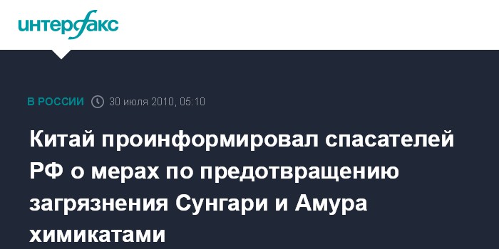 Хабаровск. 30 июля. ИНТЕРФАКС-ДАЛЬНИЙ ВОСТОК - Китайская сторона подтвердила факт попадания в реку Сунгари (приток Амура) бочек с химикатами и выразила готовность своевременно представлять информацию о случившемся.