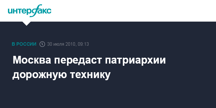 Москва. 30 июля. INTERFAX.RU - Столичные власти подарят Московской патриархии коммунальную дорожную технику, сообщили "Интерфаксу" в городской администрации в пятницу. "Согласно распоряжению мэра Москвы Юрия Лужкова ГУП "Доринвест" передаст Московской патриархии Русской православной церкви 32 единицы коммунальной дорожной техники", - сказал собеседник агентства. Он уточнил, что в перечень передаваемой в дар техники входят самосвалы, погрузчики, комбинированные дорожные и тротуароуборочные машины, бульдозер и экскаватор.