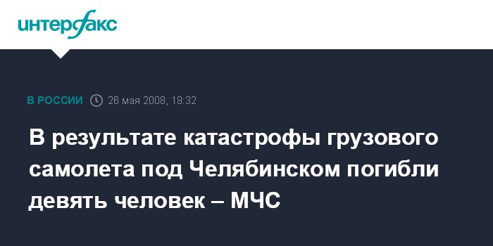 Москва. 26 мая. ИНТЕРФАКС - Девять человек погибли в результате катастрофы грузового самолета Ан-12 под Челябинском, сообщили "Интерфаксу" в МЧС России.