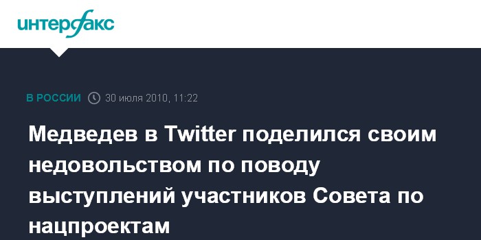 Москва. 30 июля. INTERFAX.RU - Президент РФ Дмитрий Медведев на своей страничке в Twitter устроил "разнос" Совету по реализации приоритетных нацпроектов и демографической политике. Он раскритиковал в Twitter доклады, прозвучавшие на состоявшемся в минувший четверг заседании Совета. "Если кто-то все-таки посмотрел трансляцию (хватило терпения), можете сделать выводы сами. Проблемы важнейшие, а слушать невозможно", - поделился президент РФ своими впечатлениями от заседания, которое шло в прямом телеэфире. "Очень много слов было сказано. Практических действий и предложений по решению проблем не услышал. Очень жаль. Это не работа", - написал Медведев в Twitter вечером в четверг.