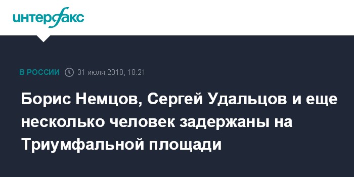 Москва. 31 июля. INTERFAX.RU - Известный оппозиционный политик Борис Немцов, лидер Левого фронта Сергей Удальцов и еще, по меньшей мере, около десяти человек, задержаны за попытку провести несанкционированную акцию в Москве на Триумфальной площади в субботу вечером, передает корреспондент "Интерфакса".