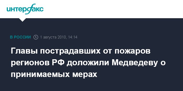 Сочи. 1 августа. INTERFAX.RU - Президент РФ Дмитрий Медведев в оперативном режиме получает доклады от руководителей регионов, пострадавших от пожаров, сообщили "Интерфаксу" в пресс-службе главы государства.