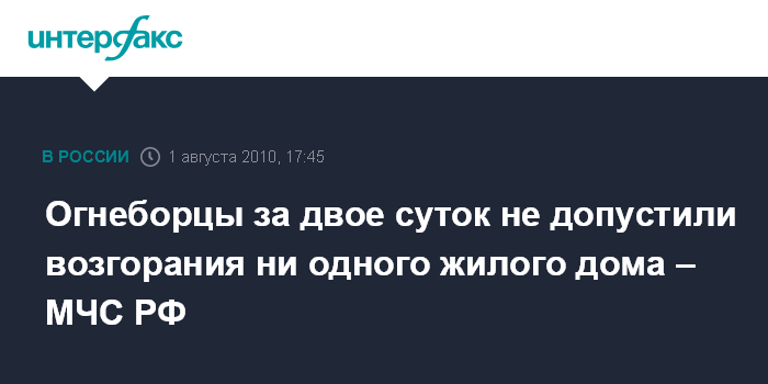 Москва. 1 августа. INTERFAX.RU - За последние двое суток в России природные пожары не затронули ни одного жилого дома, ни один человек не погиб, заявляет руководитель управления информации МЧС РФ Ирина Андрианова. "За последние двое суток сотрудники МЧС не допустили возгорания ни одного жилого дома, также не допущена гибель людей. За сегодняшний день возникло 320 очагов пожаров, потушено 210", - сказала И.Андрианова журналистам в воскресенье. Она отметила, что площадь лесных пожаров за сутки уменьшилась на 7 тысяч гектаров и сейчас составляет 128 тысяч гектаров.