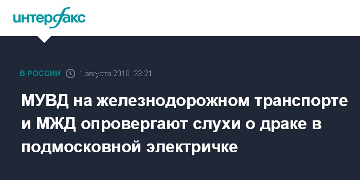 Москва. 1 августа. ИНТЕРФАКС - Пресс-служба Московского управления внутренних дел на железнодорожном транспорте и Московской железной дороге официально опровергает информацию, распространенную в ряде СМИ о якобы имевшей место драке в электропоезде "Петушки-Москва".